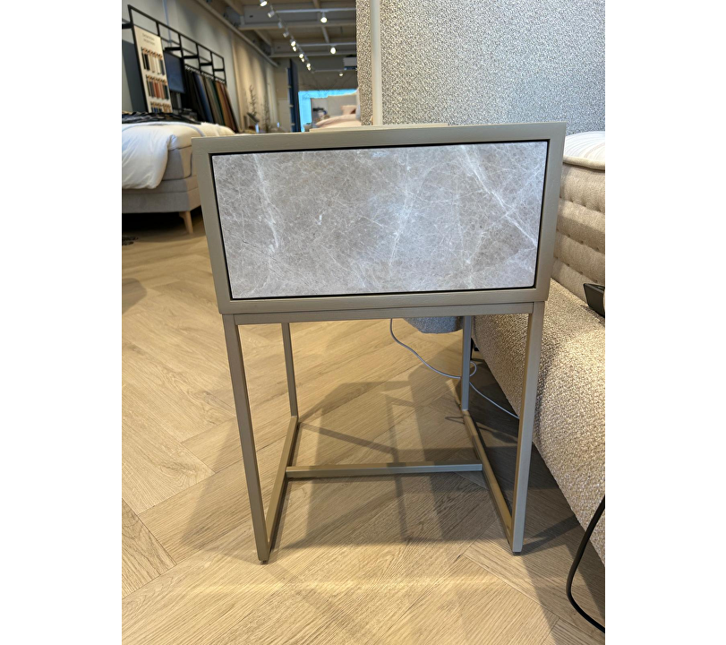 Nachtkastje Dennis is ontworpen met oog voor detail en stijl. De lade is afgewerkt met een marmerlook fineer, wat zorgt voor een rijke en natuurlijke uitstraling. In combinatie met het slanke metalen frame in champagnekleur ontstaat er een modern én elegant geheel.
