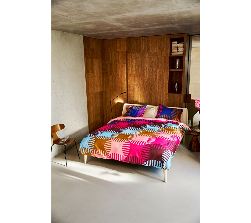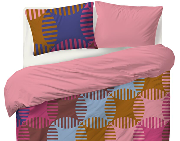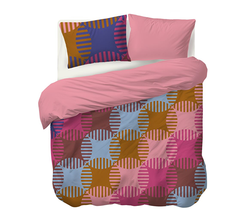 Breng kleur en energie in je slaapkamer met het Auping Bright Kaleidoscope dekbedovertrek. De speelse cirkels in tinten van camel, blauw, pink en rosé geven je bed een levendige, moderne uitstraling. Zin in wat meer rust? Draai het overtrek om naar de effen blauwe achterkant voor een kalme, stijlvolle look.