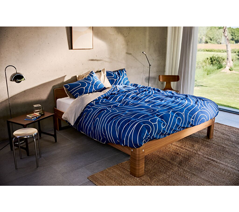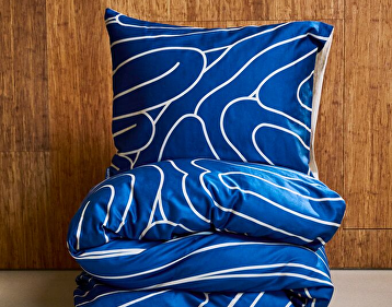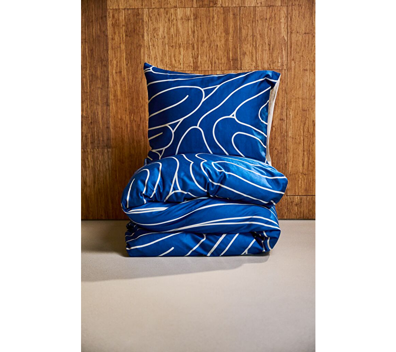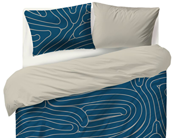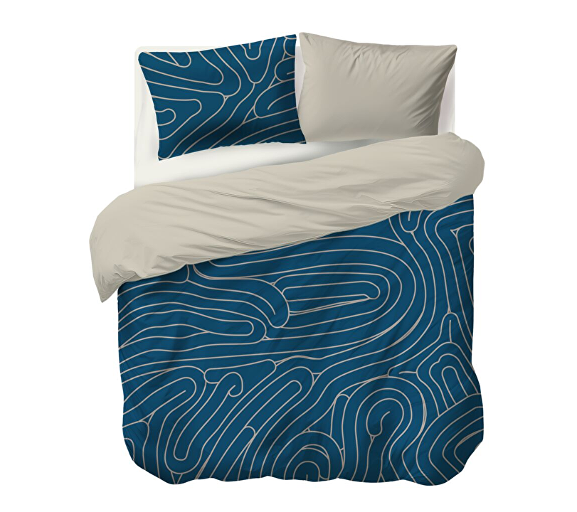 Het Meandering Blue dekbedovertrek is geïnspireerd op het rustige verloop van een rivier die haar weg vindt. De diepe blauwe basis wordt verfraaid met een warm beige patroon, terwijl de achterzijde en kussenslopen volledig in zacht beige zijn uitgevoerd.