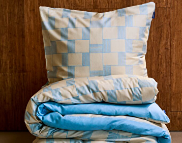 Stijlvol & fris design: offwhite basis met fijn lichtblauw gridpatroon en effen blauwe achterzijde.