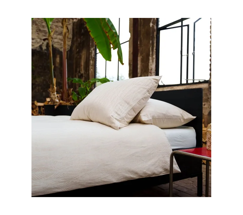 Dekbedovertrek Chika heeft een naturel kleur met daarop grafische palmbladeren. De onderzijde van het overtrek is wit. Een top overtrek om de luxe boho vibes naar je slaapkamer te halen!
