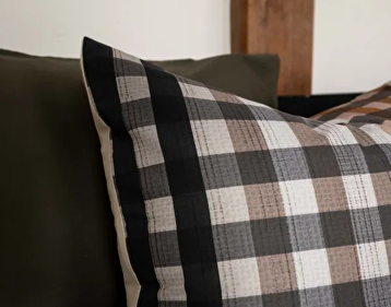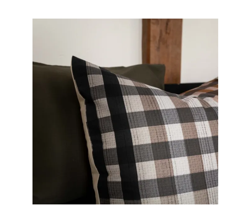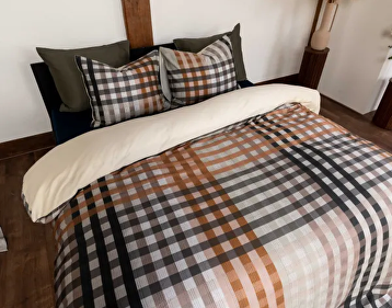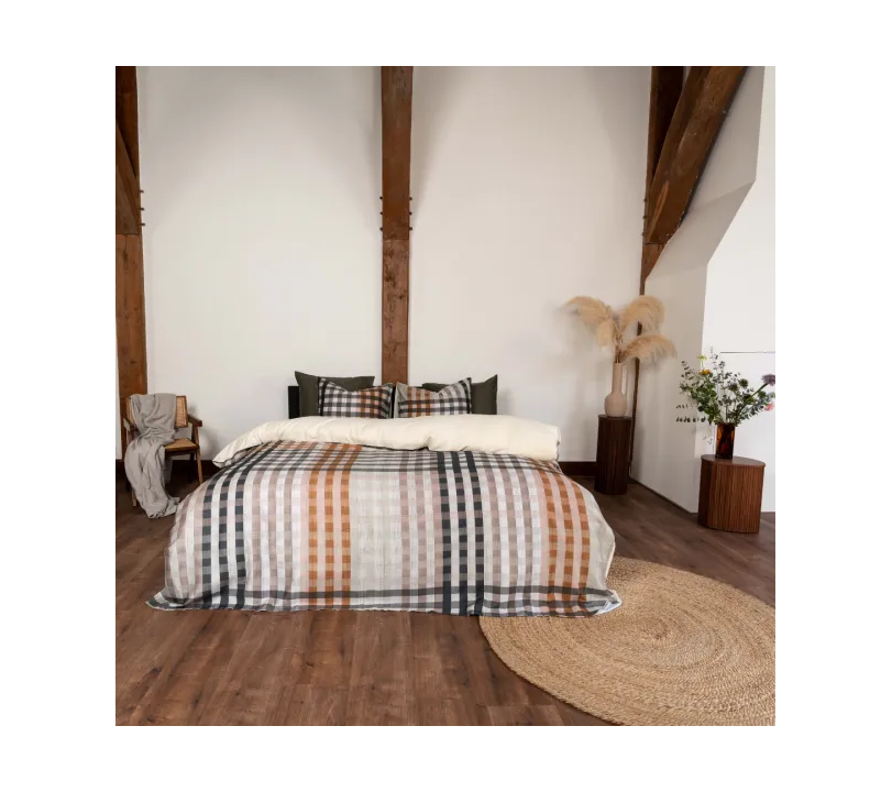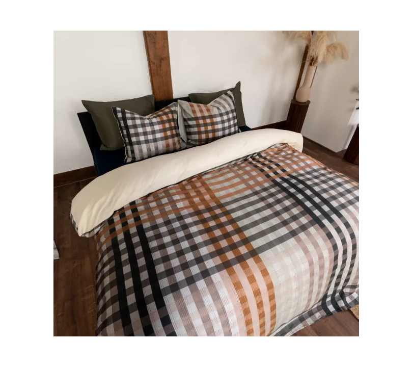 Dekbedovertrek Taru geeft een moderne twist aan het ruitjes patroon dat we allemaal kennen. Deze versie is uitgebeeld met aardetint kleuren, die in elkaar overlopen, van zwart naar bruin en beige.